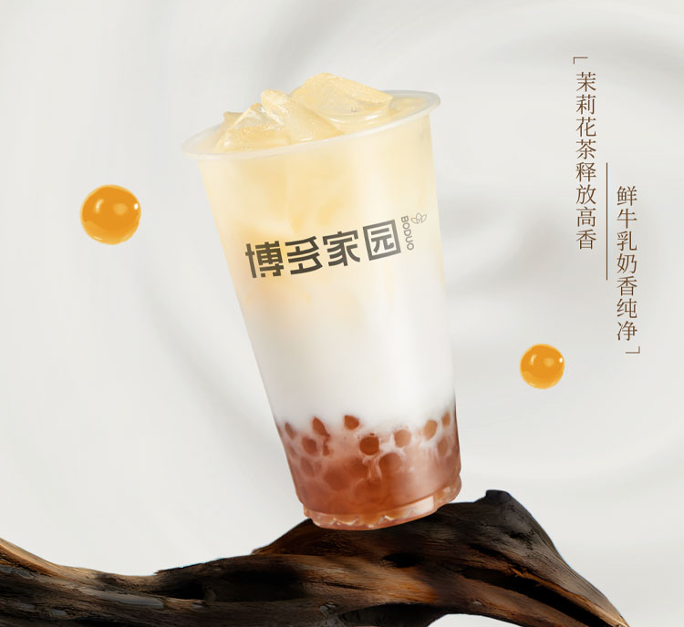 High-aroma jasmine tea releases its floral charm, dancing lightly with the clean, creamy flavor of fresh milk. Amber pearls shimmer like tiny golden gems, firm yet tender to the bite.