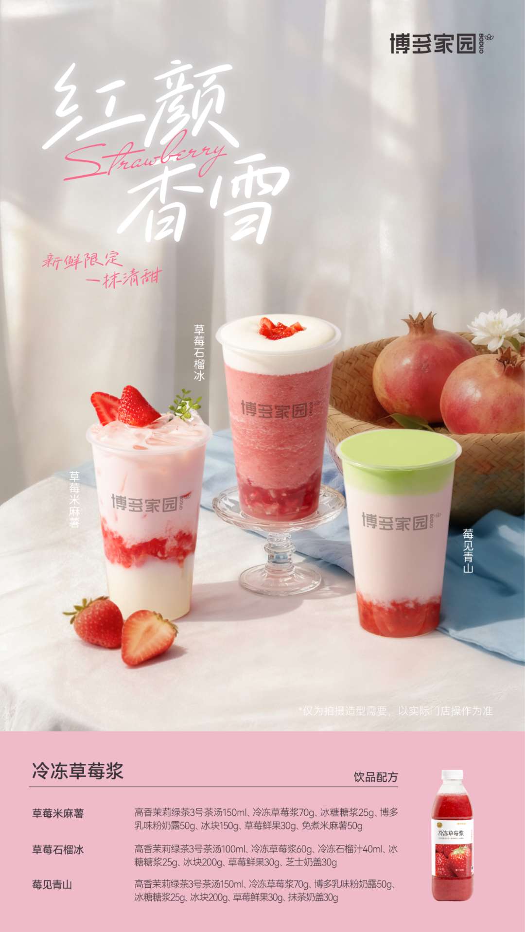 | Matcha Strawberry Peak | Jasmine Green Tea No.3, frozen strawberry purée, Boduo Milk Creamer, rock sugar syrup, ice cubes, fresh strawberry, matcha milk cap | - Jasmine Green Tea No.3: 150 ml - Frozen strawberry purée: 70 g - Boduo Milk Creamer: 50 g - Rock sugar syrup: 25 g - Ice cubes: 200 g - Fresh strawberry: 30 g - Matcha milk cap: 30 g |